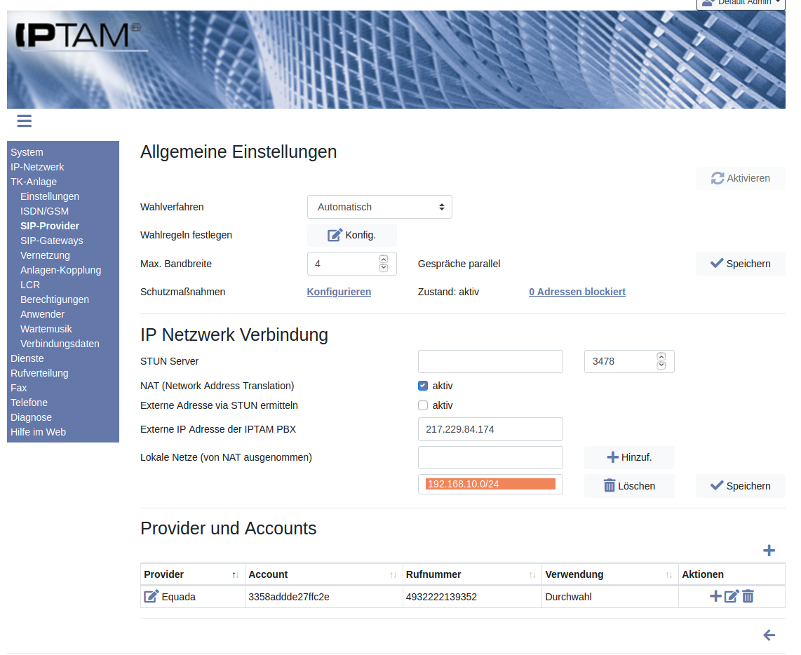 Bei „Lokale Netze (von NAT ausgenommen)“ tragen Sie das lokale Netz der Telefonanlage ein (z.B. 192.168.10.0/24, (Hinweise dazu). Ggf ergänzen Sie weitere Netze (z.B. wenn Sie Telefone via VPN an der IPTAM® PBX betreiben).