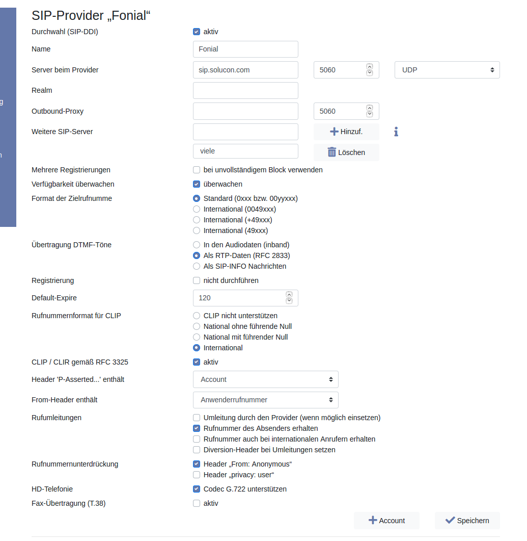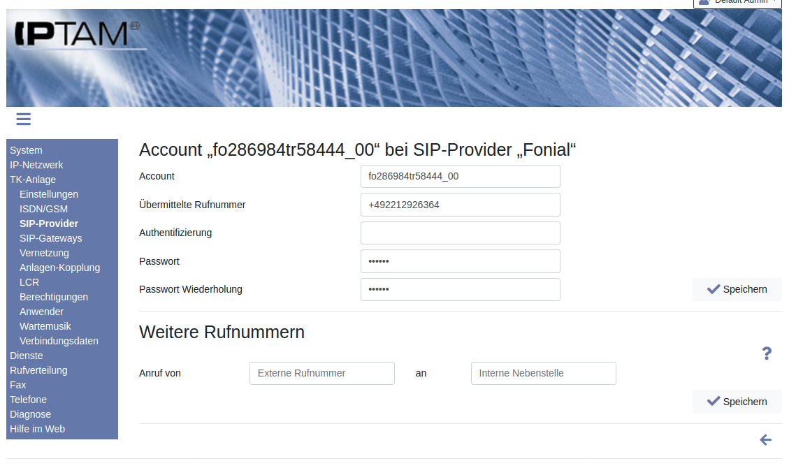 Image Mit dem Account registriert sich Ihre IPTAM® PBX beim Provider. Tragen Sie die Daten wie beispielhaft in der Abbildung gezeigt ein.