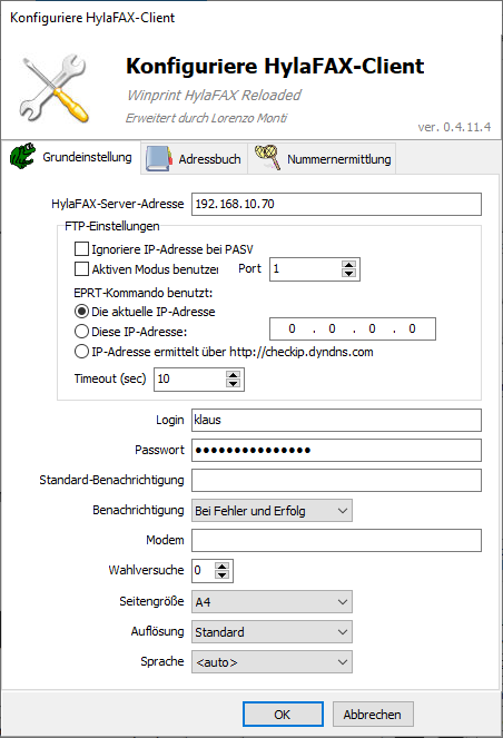 Image Image Starten Sie nun das Programm und klicken Sie auf den Button „Konfigurieren“. Tragen Sie bei „HylaFAX Server-Adresse“ die IP-Adresse Ihrer IPTAM® PBX ein. Bei „Benutzername“ tragen Sie den Account der Fax-Nebenstelle ein. Das zugehörige Client-Passwort tragen Sie bei „Passwort“ ein.