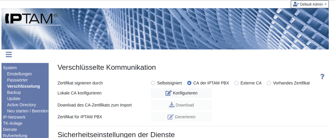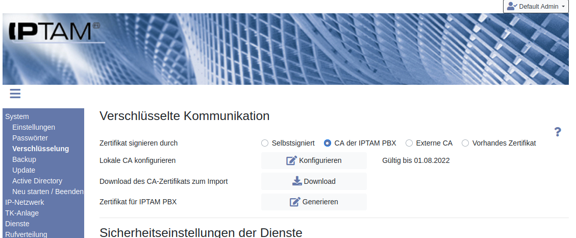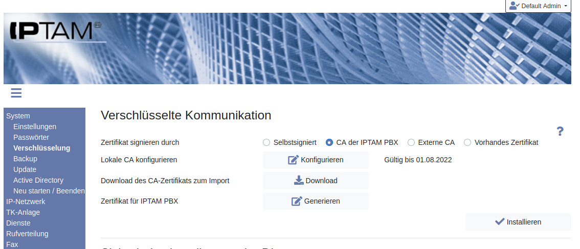 Die IPTAM® PBX bietet eine interne Zertifizierungsstelle (CA), um das Server-Zertifikat der Telefonanlage durch diese unterschreiben zu lassen. Um das Zertifikat dann verwenden zu können, müssen Sie die interne CA der IPTAM® PBX als vertrauenswürdige CA in Ihrem Browser eintragen.