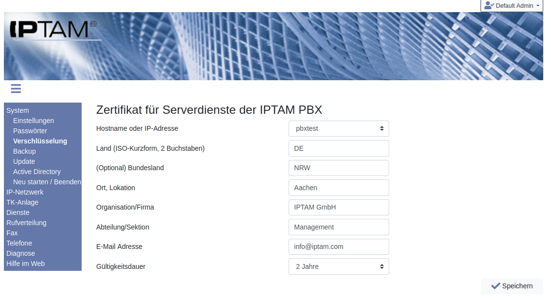 Image Sie benötigen nun noch das eigentliche Server-Zertifikat. Klicken Sie dazu auf „Generieren“. Sie sehen die Felder des Zertifikats, wobei diese mit denen des CA-Zertifikats vorbesetzt sind. Die Angabe unter „Hostname oder IP-Adresse“ verwenden Sie später in den URLs, wenn Sie die Web-Seite Ihrer IPTAM® PBX per HTTPS aufrufen (Wenn Sie im Zertifikat den Hostnamen verwenden und in den URLs später die IP-Adresse, wird Ihr Browser eine Sicherheitswarnung anzeigen, weil das Zertifikat nicht zur URL passt). Klicken Sie auf „Speichern“, um die Einstellungen zu übernehmen.