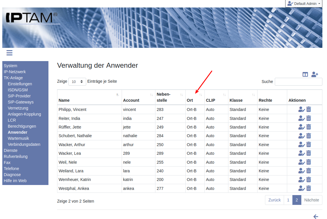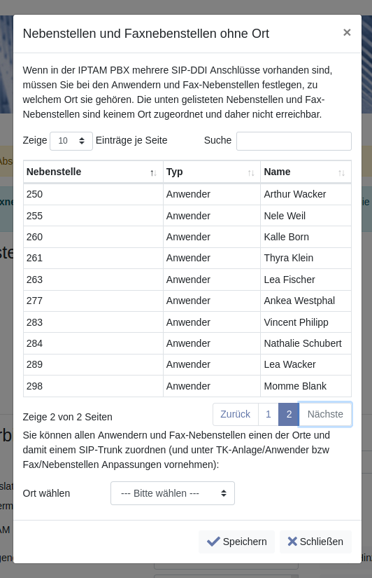 Image Image Wenn Sie den Dialog über das Icon verlassen, sehen Sie die Übersicht der Accounts (Abbildung links). Der blaue Hinweis oben erscheint, wenn in Ihrer IPTAM® PBX Anwender angelegt sind, die keinen Bezug zu einem Ort haben. Über den Link kann allen Anwendern ein Ort zugeordnet werden (Abbildung rechts). Wählen Sie den Ort aus der Ausklappbox. Alle Anwender werden diesem Ort zugeordnet. Sie können anschließend einzelne Anwender einem anderen Ort zuordnen.