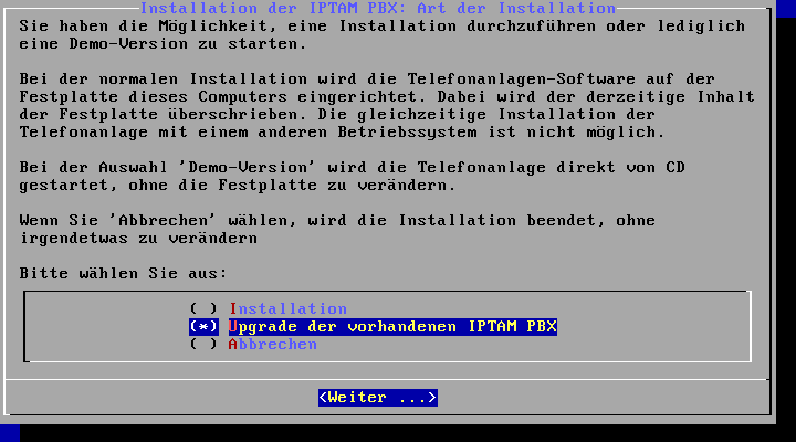 ®,PBX mit der auf dem Medium vorhandenen identisch ist. Sollte die aktuell installierte Version der IPTAM PBX nicht mit der Version auf dem Medium übereinstimmen, erhalten Sie einen entsprechenden Hinweis. Sie müssen dann zunächst ein