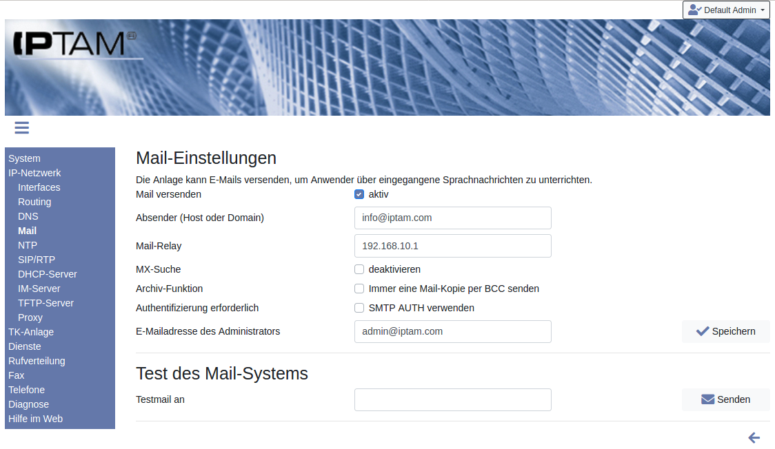 Image Die IPTAM® IP-Telefonanlage kann ihre Benutzer per E-Mail darüber informieren, wenn sie eine neue Voicemail erhalten haben. Auch der Fax-Server nutzt E-Mails beim Empfang sowie für die Sendebestätigungen. Hierzu muss der Telefonanlage jedoch ein Mailserver (Mail-Relay) bekannt sein, über den sie die Nachrichten versenden kann. Diese Konfiguration können sie im Menü IP-Netzwerk►Mail vornehmen. Als „Absender“ kann ein Host- oder Domainname oder eine vollständige E-Mail-Adresse angegeben werden. Dieser Absender muss von Ihrem verwendeten Mail-Relay akzeptiert werden.