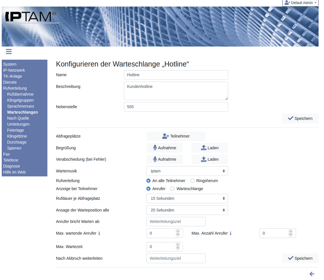 Image Im Weiteren wird die Einrichtung einer Warteschlange „Hotline“ beschrieben. Hierzu wird im Feld „Name“ der Name „Hotline“ eingetragen und im Feld „Nebenstelle“ die Durchwahl „555“ festgelegt. Über den Button „ Speichern“ werden diese grundlegenden Einstellungen gespeichert und die Maske zur erweiterten Konfiguration der Warteschlange öffnet sich (siehe Abbildung links).
