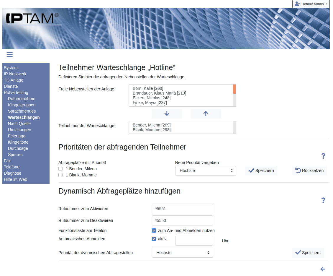 In der Grundeinstellung erhalten alle Abfragepätze die höchste Priorität. Um die Priorität für eine oder mehrere Nebenstellen zu ändern, klicken Sie auf die Checkbox vor dem entsprechenden Namen, wählen über das Auswahlfeld eine neue Priorität aus und klicken auf den Button „ Speichern“. Mit Klick auf den Button „ Rücksetzen“ erhalten alle Teilnehmer wieder die Priorität 1.
