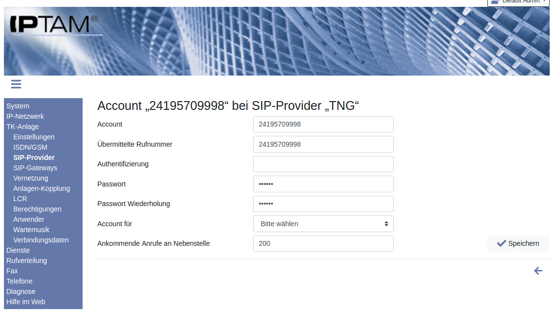 Der Provider TNG konfiguriert die SIP-Anschlüsse in der Regel so, dass Anrufe aus dem eigenen Ortsnetz ohne Ortsnetzkennzahl übergeben werden. Bitte informieren Sie TNG, dass die Anrufe ungekürzt übergeben werden, da die IPTAM@ PBX die Anrufe sonst nicht korrekt annehmen kann.