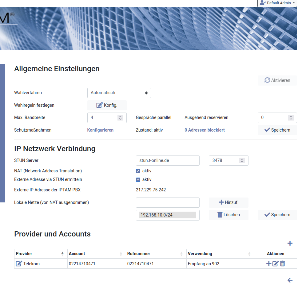 Bei „Lokale Netze (von NAT ausgenommen)“ tragen Sie das lokale Netz der Telefonanlage ein (z.B. 192.168.10.0/24, (Hinweise dazu). Ggf ergänzen Sie weitere Netze (z.B. wenn Sie Telefone via VPN an der IPTAM® PBX betreiben).