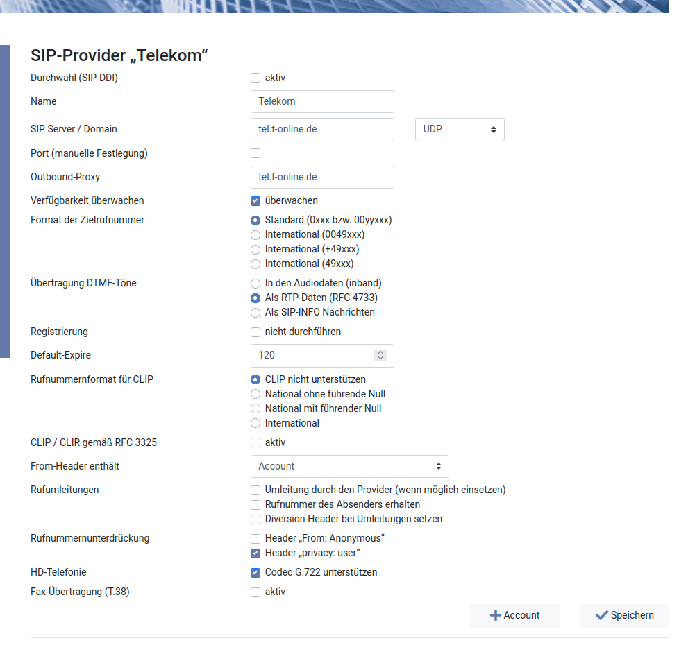 Klicken Sie nach der Einrichtung der Accounts oben rechts auf der Seite TK-Anlage►SIP-Provider auf „Aktivieren“. Es sollte keine Fehlermeldung erscheinen.Den Erfolg können Sie auf der Seite Diagnose►SIP-Provider überprüfen.