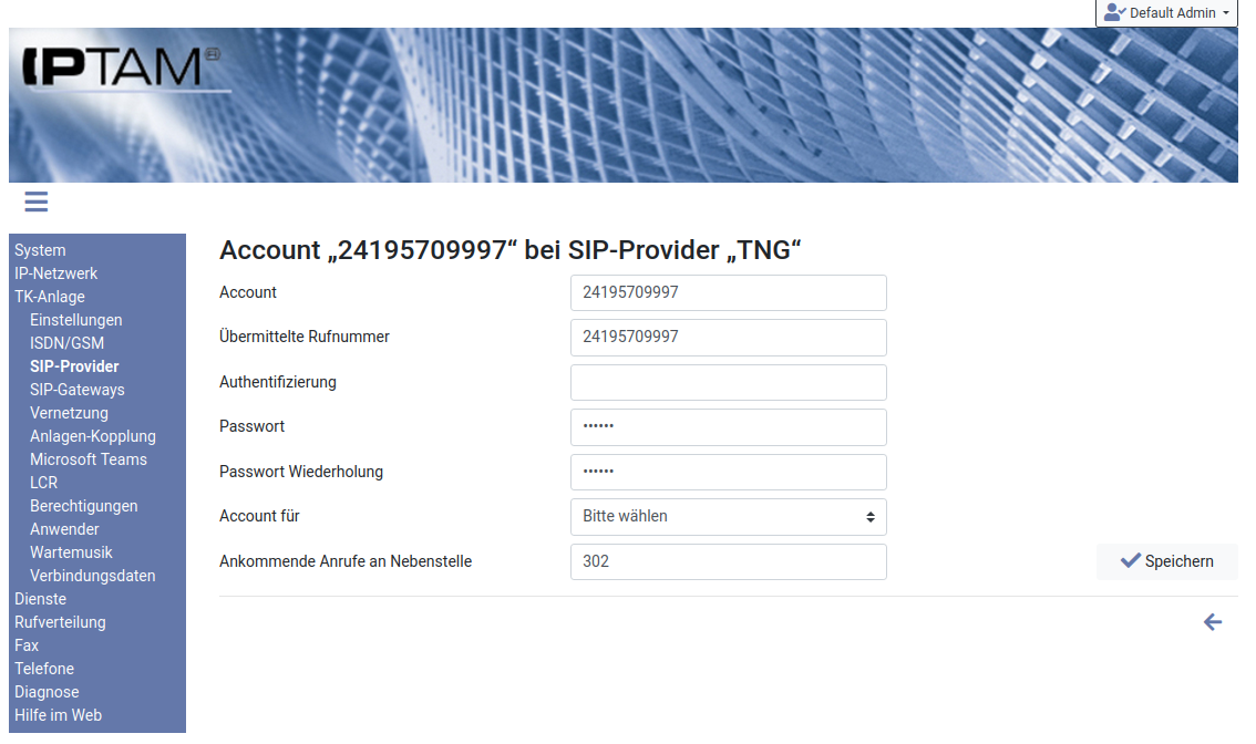 Der Provider TNG konfiguriert die SIP-Anschlüsse in der Regel so, dass Anrufe aus dem eigenen Ortsnetz ohne Ortsnetzkennzahl übergeben werden. Bitte informieren Sie TNG, dass die Anrufe ungekürzt übergeben werden, da die IPTAM@ PBX die Anrufe sonst nicht korrekt annehmen kann.