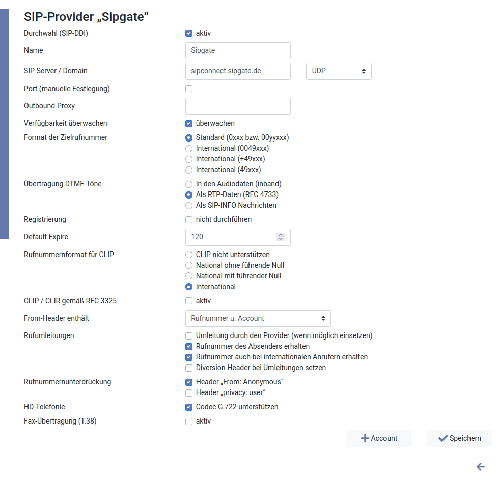 Bei Account wird der SIP-Account wie von Sipgate mitgeteilt eingetragen. Er endet üblicherweise mit „t0“. Die „übermittelte Rufnummer“ wird im internationalen Format (49xxx) eingetragen, wobei die Rufnummer ohne den Rufnummernblock verwendet wird. Das Passwort tragen Sie wie vom Provider Sipgate mitgeteilt ein.