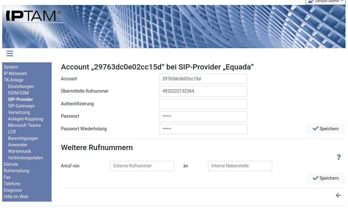 Image Mit dem Account registriert sich Ihre IPTAM® PBX beim Provider. Tragen Sie die Daten wie beispielhaft in der Abbildung gezeigt ein.