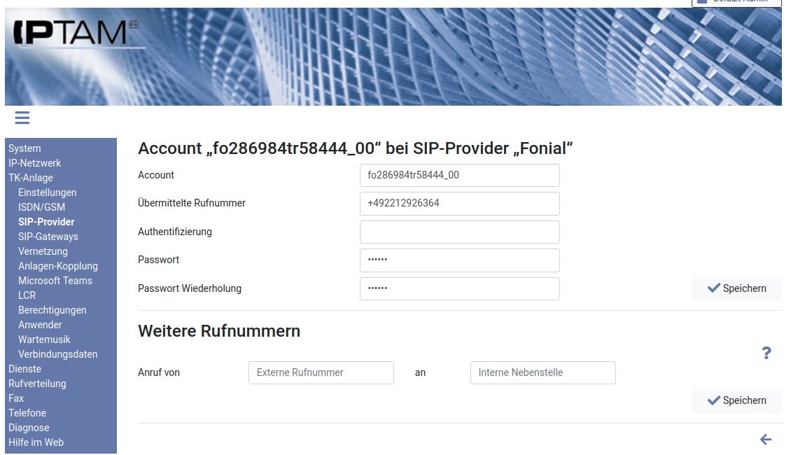 Image Mit dem Account registriert sich Ihre IPTAM® PBX beim Provider. Tragen Sie die Daten wie beispielhaft in der Abbildung gezeigt ein.