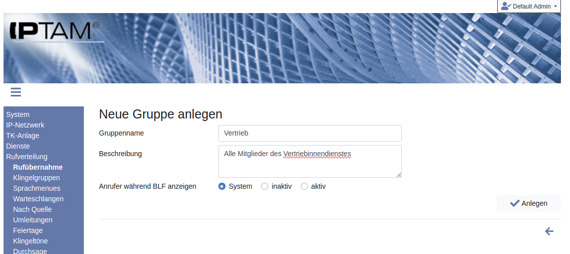 Image Nach einem Klick auf „ Anlegen“ erweitert sich der Dialog, so dass Sie Anwender Ihrer Telefonanlage als Gruppenmitglieder auswählen können. Wenn an Telefonen die BLF Funktion genutzt wird, können diese je nach Konfiguration auch Informationen zum Anrufer anzeigen, was nicht immer gewünscht ist. Die systemweite Vorgabe dazu stellen Sie unter Telefone►Einstellungen „Anrufer während BLF anzeigen“ ein. Die gleichnamige Einstellung in diesem Dialog dient dazu, für diese Gruppe ein abweichendes Verhalten einzustellen.