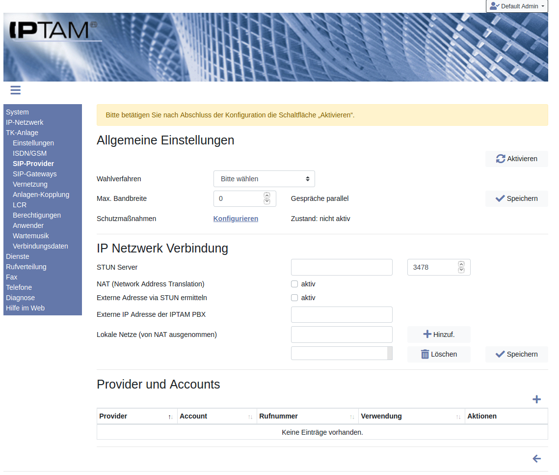 Image Der Anschluss von Telefonanlagen erfolgt heutzutage in der Regel über Voice over IP mit Hilfe des Session Initiation Protocols (SIP). Ihre IPTAM® PBX unterstützt dies mit vielfältigen Einstellungen, die Sie im Menü TK-Anlage►SIP-Provider vornehmen. Der noch nicht konfigurierte Dialog ist links dargestellt.