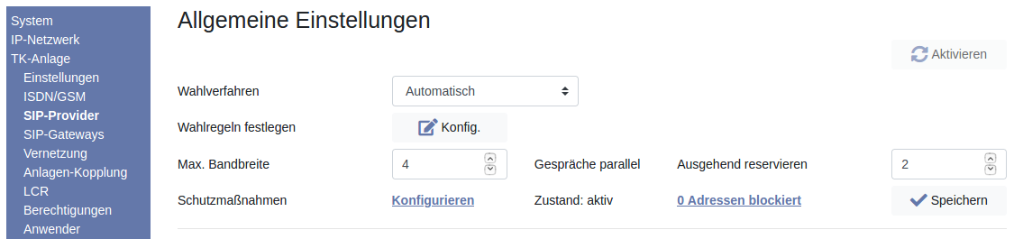 Image Wichtig: Beachten Sie den Hinweis oben auf der Seite TK-Anlage►SIP-Provider und klicken Sie zum Abschluss auf den Button „ Aktivieren.“