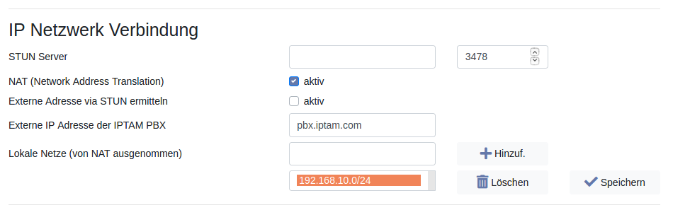 Image Verfügt Ihr Anschluss über eine statische externe IP-Adresse, so tragen Sie diese als „Externe IP Adresse der IPTAM PBX“ im Abschnitt „IP Netzwerk Verbindung“ ein. Setzen Sie das Häkchen bei „NAT (Network Address Translation) aktiv“. Tragen Sie noch die lokalen Netze ein (siehe unten).