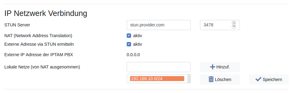 Image Wenn Ihre Firewall bzw Ihr Router über eine SIP Application Level Gateway (ALG) verfügt, tragen Sie im Abschnitt „IP Netzwerk Verbindung“ nichts ein. Sie können jedoch auch einen STUN-Server eintragen (z.B. den Ihres Providers). In diesem Fall wird die IPTAM PBX bei einer Änderung der externen IP-Adresse automatisch eine Re-Registrierung anstoßen. Die NAT-Behandlung obliegt jedoch Ihrem Router / Ihrer Firewall.