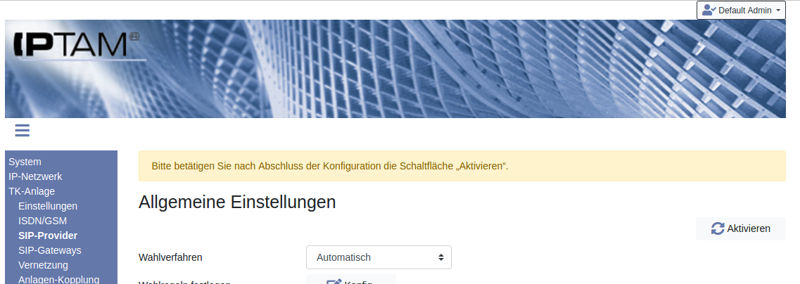 Image Die IPTAM® PBX unterstützt den gleichzeitigen Anschluss an der öffentliche Netz über Voice over IP und ISDN. In den meisten Fällen ist das heute nicht mehr der Fall. Falls Ihre Telefonanlage ausschließlich über SIP an das öffentliche Netz angeschlossen ist, stellen Sie das Wahlverfahren auf „Automatisch“ und ignorieren Sie den Button „ Konfig.“.