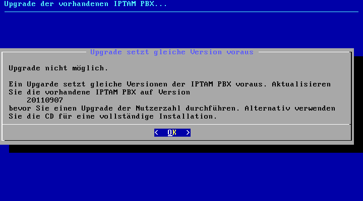 ®,PBX mit der auf dem Medium vorhandenen identisch ist. Sollte die aktuell installierte Version der IPTAM PBX nicht mit der Version auf dem Medium übereinstimmen, erhalten Sie einen entsprechenden Hinweis. Sie müssen dann zunächst ein