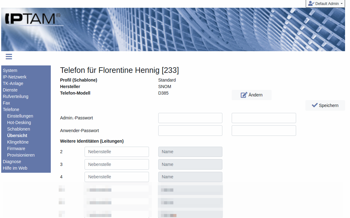 System►Passwörter vorgesehen haben, dass die Web-Oberfläche der Telefone mit individuellen Passwörtern für Anwender oder Administrator geschützt wird, legen Sie in der folgenden Maske diese Passwörter fest. Sie können die Passwörter später auch ändern oder auf die Verwendung einheitlicher Passwörter umschalten. Darüber hinaus können Sie festlegen, ob sich das Telefon dieses Anwenders mit weiteren Identitäten an der IPTAM