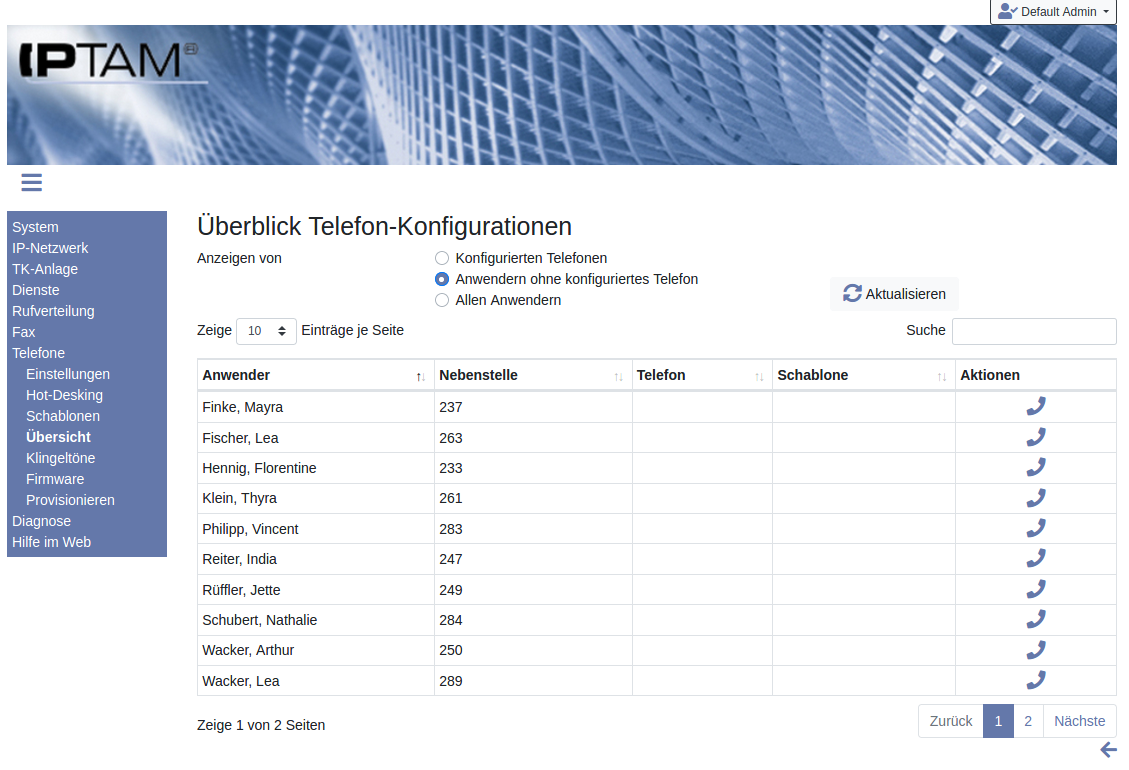 Hot-Desking einsetzen, haben Sie zusätzlich die Option, die für diesen Fall konfigurierten Telefone in der Übersicht angezeigt zu bekommen. Im Beispiel werden Ihnen die Anwender angezeigt, für die noch kein Telefon konfiguriert worden ist.