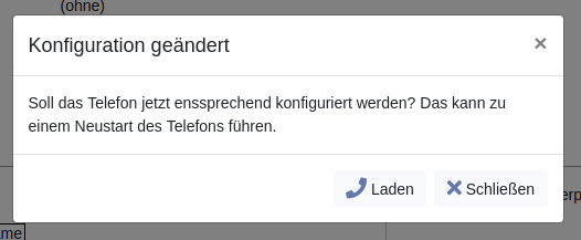 Speichern“ sichern Sie die Konfiguration des Telefons und gelangen zurück in die Übersicht. Falls Sie im Betrieb Änderungen an der Konfiguration von Telefonen vornehmen erscheint der dargestellte Dialog. Mit einem Klick auf den Button „