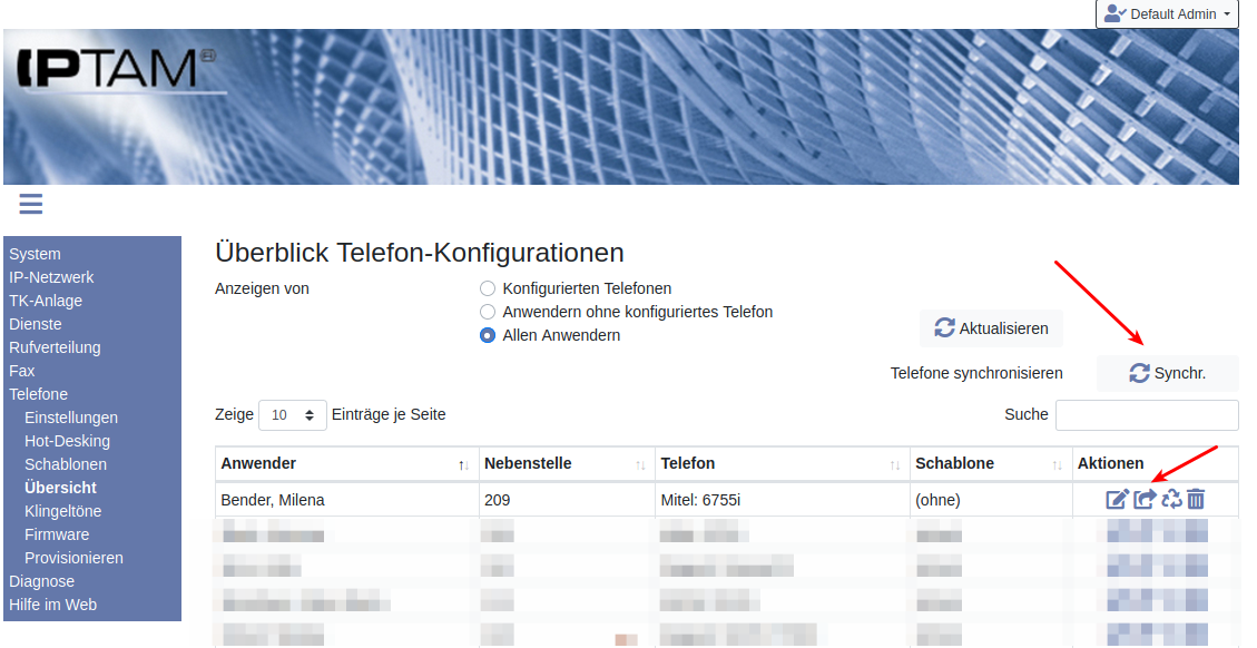 Synchr.“ klicken, werden alle Konfigurationen aktualisiert und alle Telefone werden aufgefordert, die Konfigurationen neu einzulesen. Je nach Telefonmodellen führt das im Anschluss zu einem Neustart der Telefone. Sie können diese Variante vorteilhaft einsetzen, wenn Sie Änderungen an einer Vielzahl von Telefonen vorgenommen haben, z.B. wenn Sie das