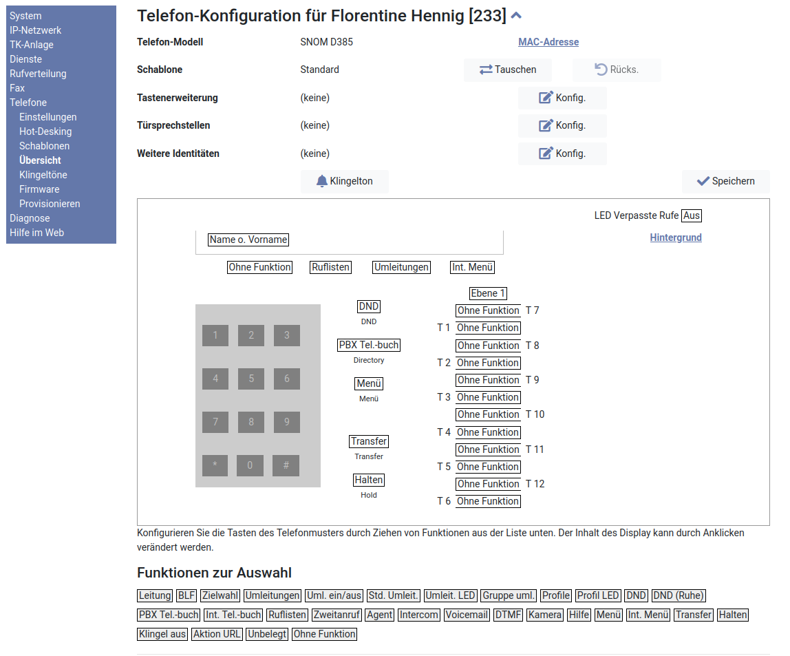 In der nebenstehenden Abbildung ist beispielhaft ein Snom D385 gezeigt, dem die Schablone „Standard“ zu Grunde liegt.
