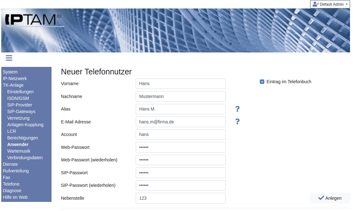 Im Feld „Account“ legen Sie den SIP-Account des Anwenders fest. Mit dem hier einge­tragenen Namen muss sich das Endgerät des Anwenders an der IPTAM® PBX anmelden. Die Anmeldung sollte mit einem Passwort geschützt werden. Das dazugehörende Passwort tragen Sie bei „SIP-Passwort" ein und wiederholen die Eingabe im darauf folgenden Feld. Auch der Zugang des Anwenders zu seinen persönlichen Einstellungen, die er über die Web-Oberfläche vornimmt (Siehe Anwenderhandbuch) sollte über ein Passwort gesichert werden. Dieses Passwort kann der Anwender selbst verändern.