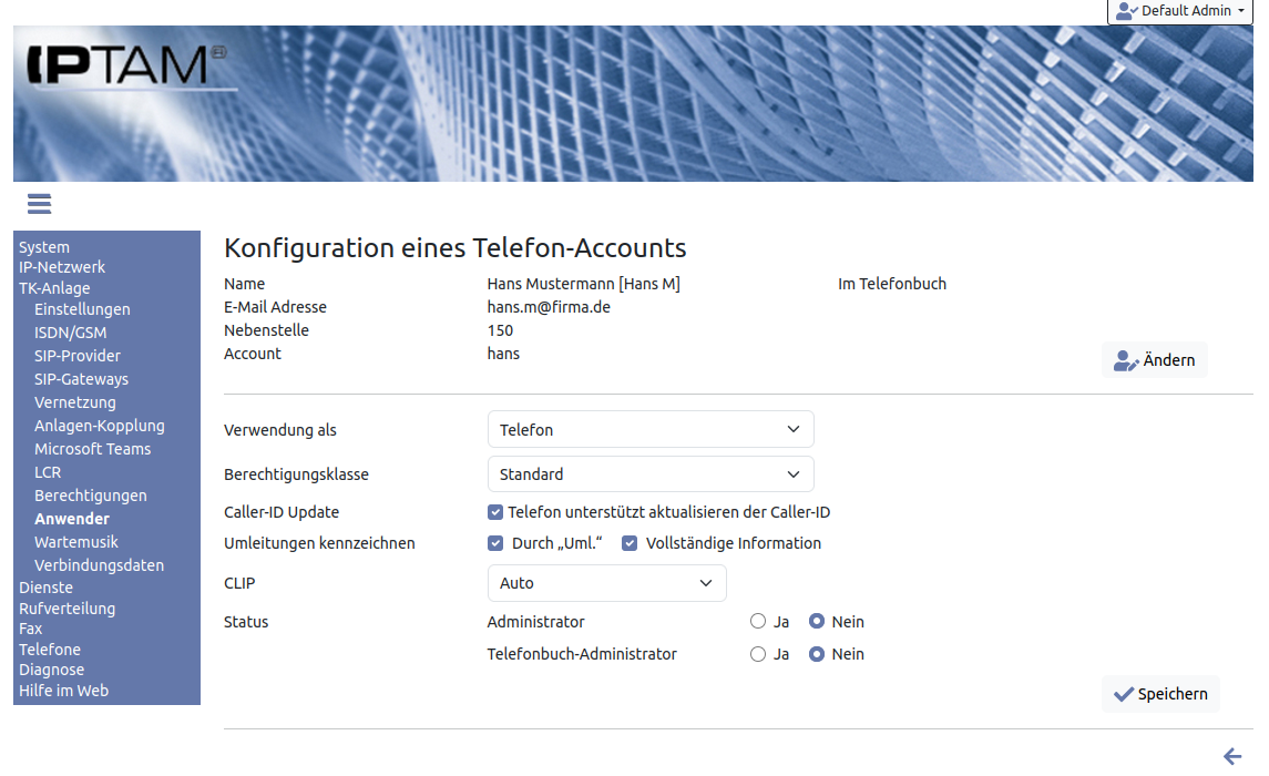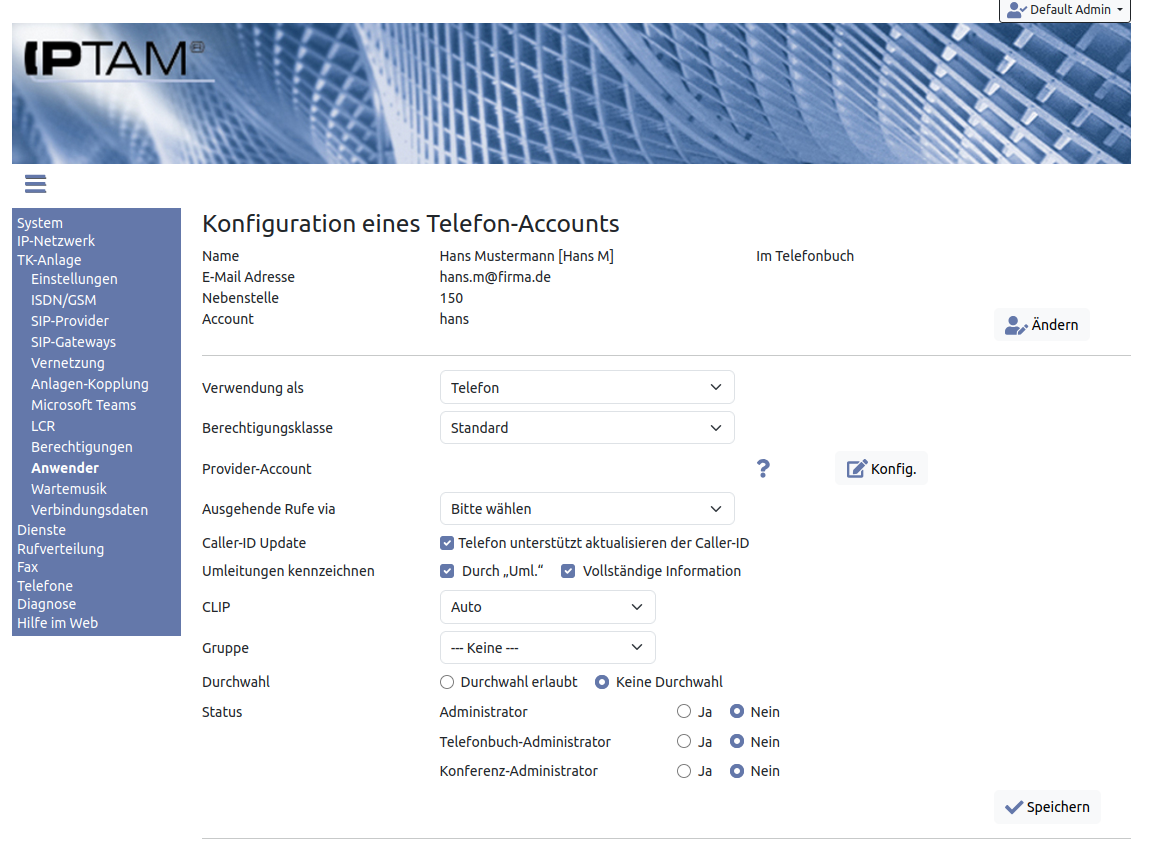 Das Auswahlfeld „Durchwahl (MSN)“ ist nur vorhanden, wenn in Ihrer IPTAM PBX mindestens einen ISDN Mehrgeräteanschluss eingerichtet haben. Sie können dann in diesem Auswahlfeld festlegen, ob diesem Anwender eine der vorhandenen MSNs zugewiesen werden soll.