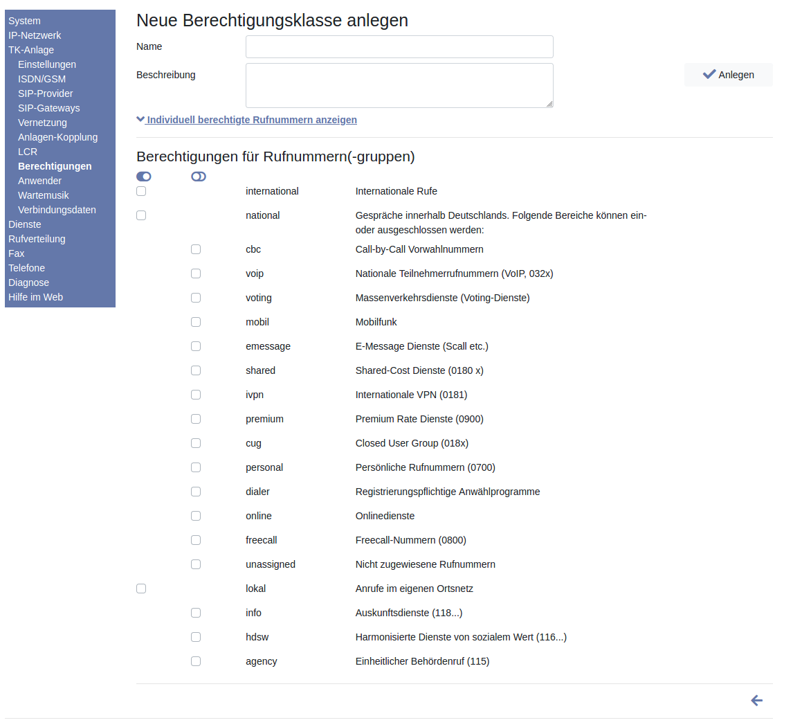 TK-Anlage Berechtigungen
