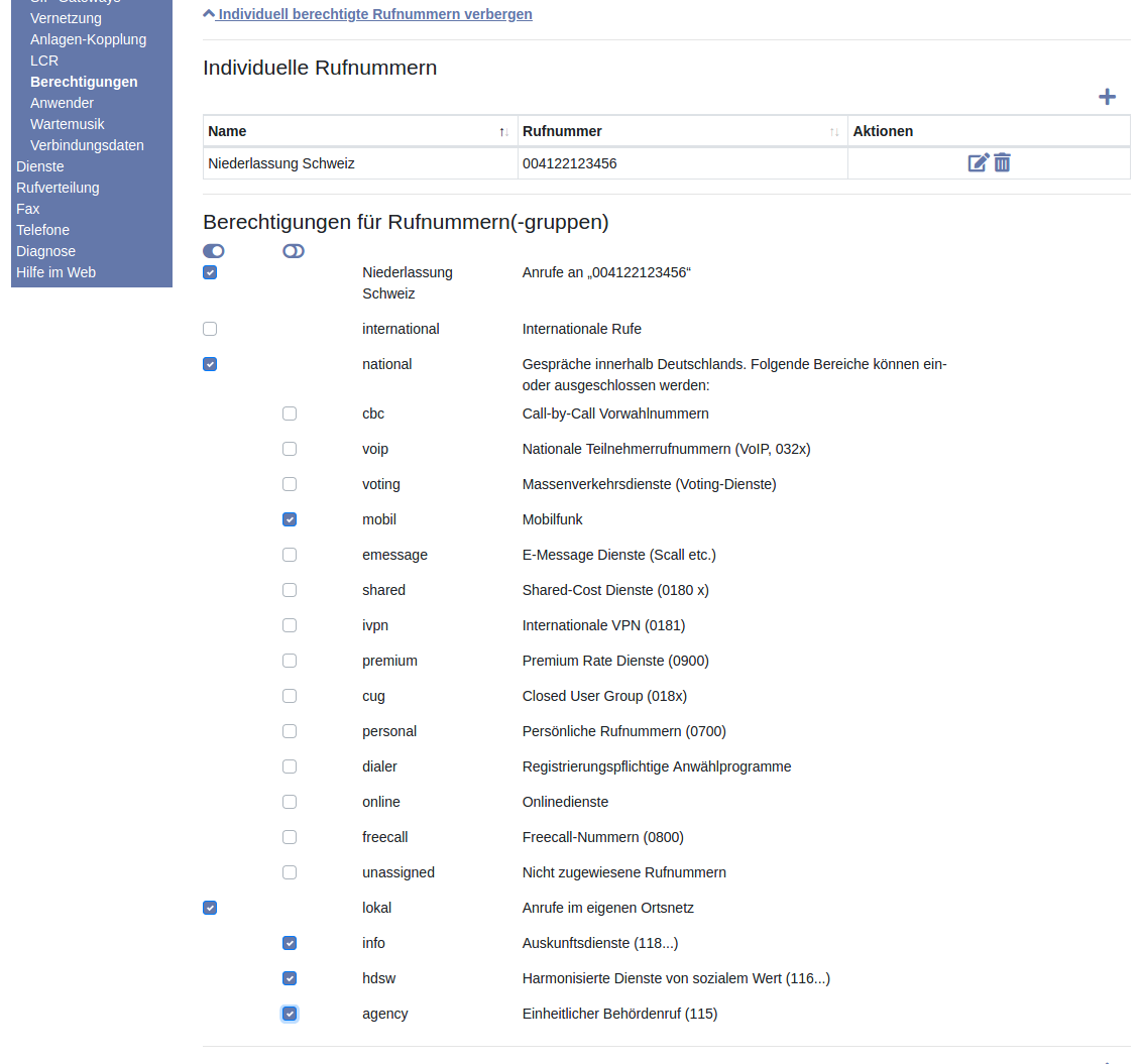Image Nach dem Speichern können Sie neben den fest definierten Rufnummernbereichen auch die selbst definierte Rufnummer als „berechtigt“ auswählen. Die Abbildung zeigt ein Beispiel, wo Auslandstelefonate mit Ausnahme der Schweizer Rufnummer +41 22 123456 nicht möglich sind.