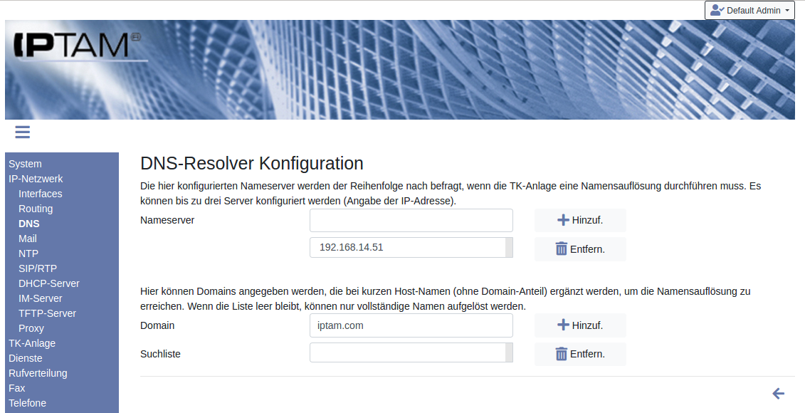 ® IP-Telefonanlage andere Rechner nicht nur über ihre IP-Adresse sondern auch über ihre Namen erreichen müssen. Sie muss daher Adressen über einen DNS Resolver auflösen können. Dazu können im Menü