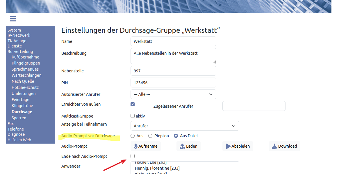 Mit Hilfe von Durchsage-Gruppen können Sie Anwendern erlauben eine Durchsage bei allen oder einem Teil der Nebenstellen durchzuführen. Der ausführende Anwender (oder der externe Anrufer) ruft die Nebenstelle der Gruppe an und autorisiert sich ggf. mit einer PIN, Anschließend beginnt er mit der Durchsage. Die in der Gruppe konfigurierten Telefone schalten beim Start der Durchsage den Lautsprecher ein und übertragen die Durchsage. Das Mikrofon der Telefone ist nicht aktiv. Der Durchsage kann ein Audio-Prompt (z.B. ein Gong) vorgeschaltet werden.Wird der Audio-Prompt als Datei bereitgestellt, besteht auch die Option, die Durchsage auf das Abspielen des Prompts zu beschränken.