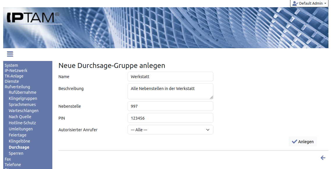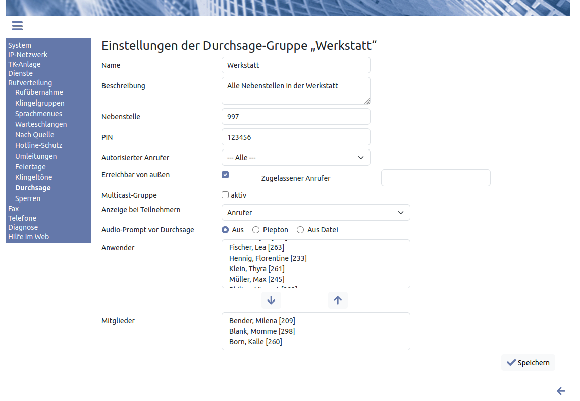 Sie vergeben einen Namen zu Dokumentationszwecken sowie eine kurze Beschreibung. Legen Sie eine Nebenstelle fest, die für eine Durchsage an diese Gruppe angerufen werden soll. Um Missbrauch zu verhindern, können Sie die Nutzung reglementieren: Sie können festlegen, dass nur ein bestimmter Anrufer eine Durchsage starten kann und Sie können eine PIN vergeben, die vor Auslösen der Durchsage-Funktion eingegeben werden muss.
