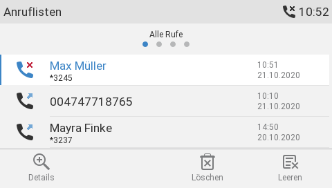 Die Telefone zeigen in der Statusanzeige Informationen wie verpasste Anrufe oder Hinweise auf neue Nachrichten auf der Voice-Mailbox (Anrufbeantworter) an. Wenn weder Anrufe verpasst wurden noch Nachrichten vorliegen, zeigen die Telefone in der Statuszeile Hinweise auf Rufumleitungen an. Dabei wird immer die „stärkste“ Form der Rufumleitung angezeigt, wenn mehrere Umleitungen aktiv sind: Wenn neben der Rufumleitung bei Nichterreichbarkeit die DND-Funktion aktiviert ist, wird der Text „Ruhe: Ziel“ für die DND-Funktion angezeigt, weil diese alle Anrufer umleitet.Den Hinweis auf „verpasste Anrufe“ können Sie über die „Abbrechen“-Taste neben dem Steuerkreuz löschen. Wenn Sie die LED in der rechten Gehäuseecke für die Anzeige verpasster Anrufe konfiguriert haben, erlischt diese dann ebenfalls. Bei Verwendung der Firmware 10.x verschwindet der Hinweis auch nach dem Anzeigen der Rufliste „verpasste Anrufe“.