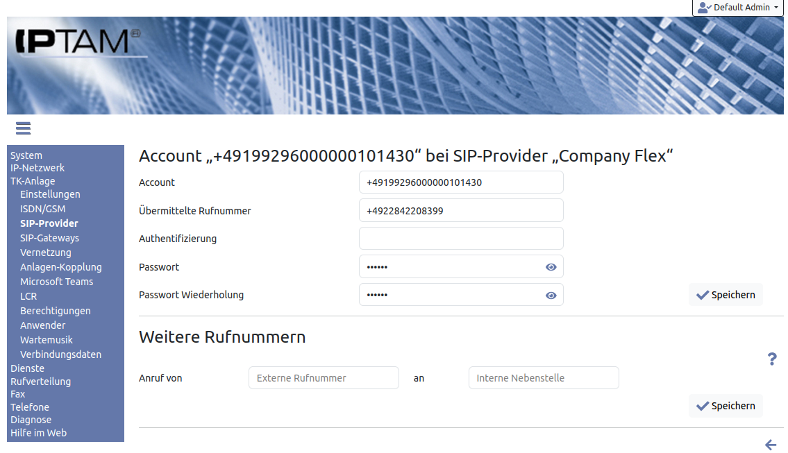 Image Mit dem Account registriert sich Ihre IPTAM® PBX beim Provider. Tragen Sie die Daten wie beispielhaft in der Abbildung gezeigt ein.