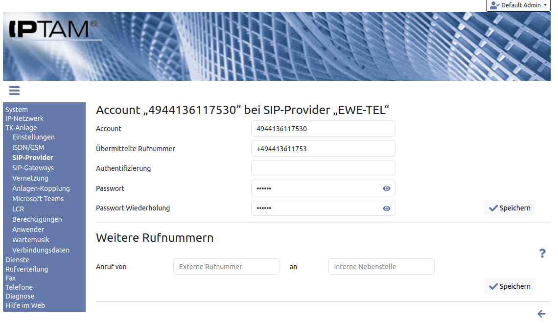 Bei Account wird der „Benutzername“ wie von EWE TEL mitgeteilt eingetragen. Die „übermittelte Rufnummer“ wird im internationalen Format (+49xxx) eingetragen, wobei die Rufnummer ohne den Rufnummernblock verwendet wird. Das Passwort tragen Sie wie vom Provider EWE TEL mitgeteilt ein.