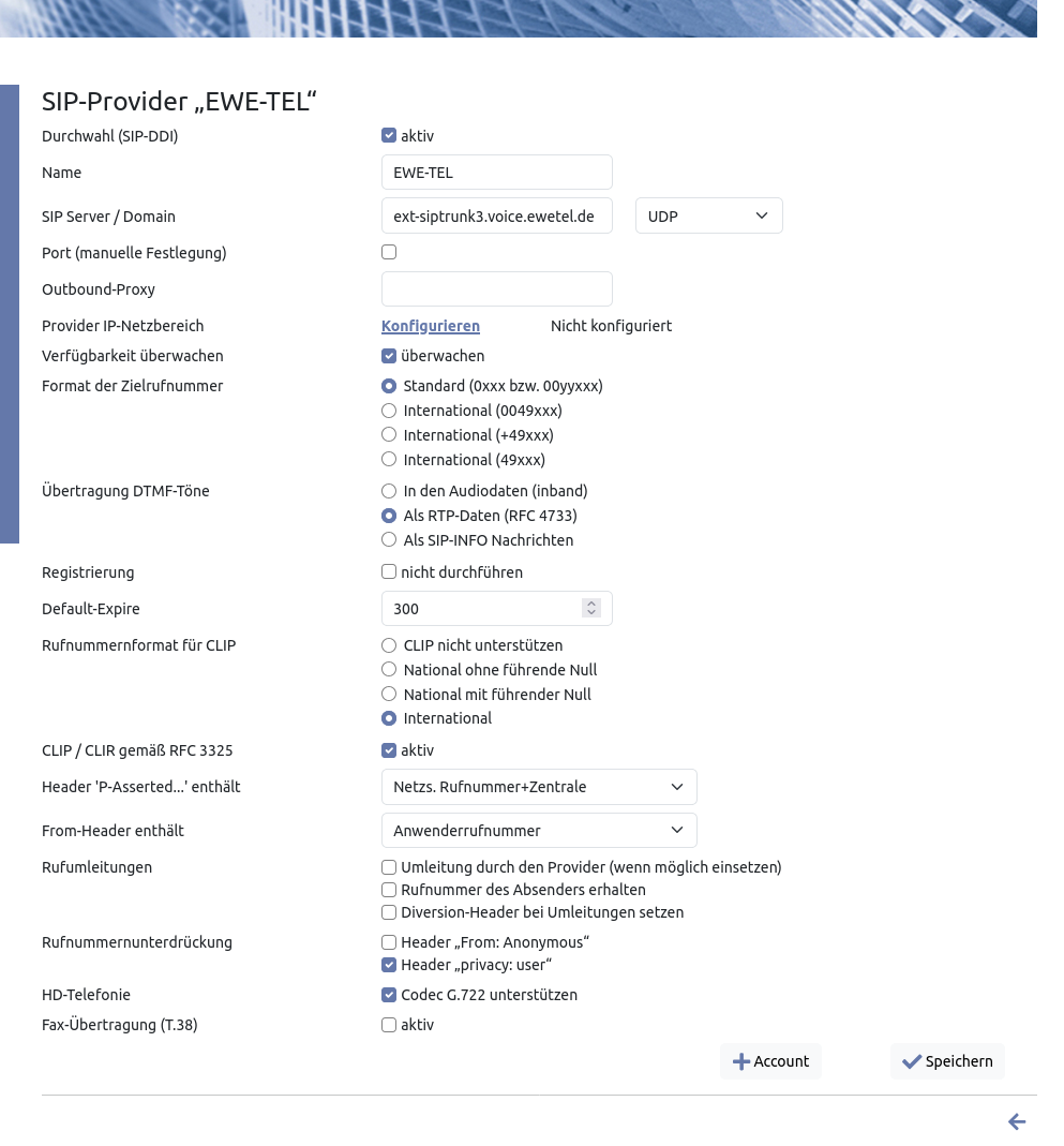 Einstellungen: EWE SIP Trunk (EWE TEL GmbH)