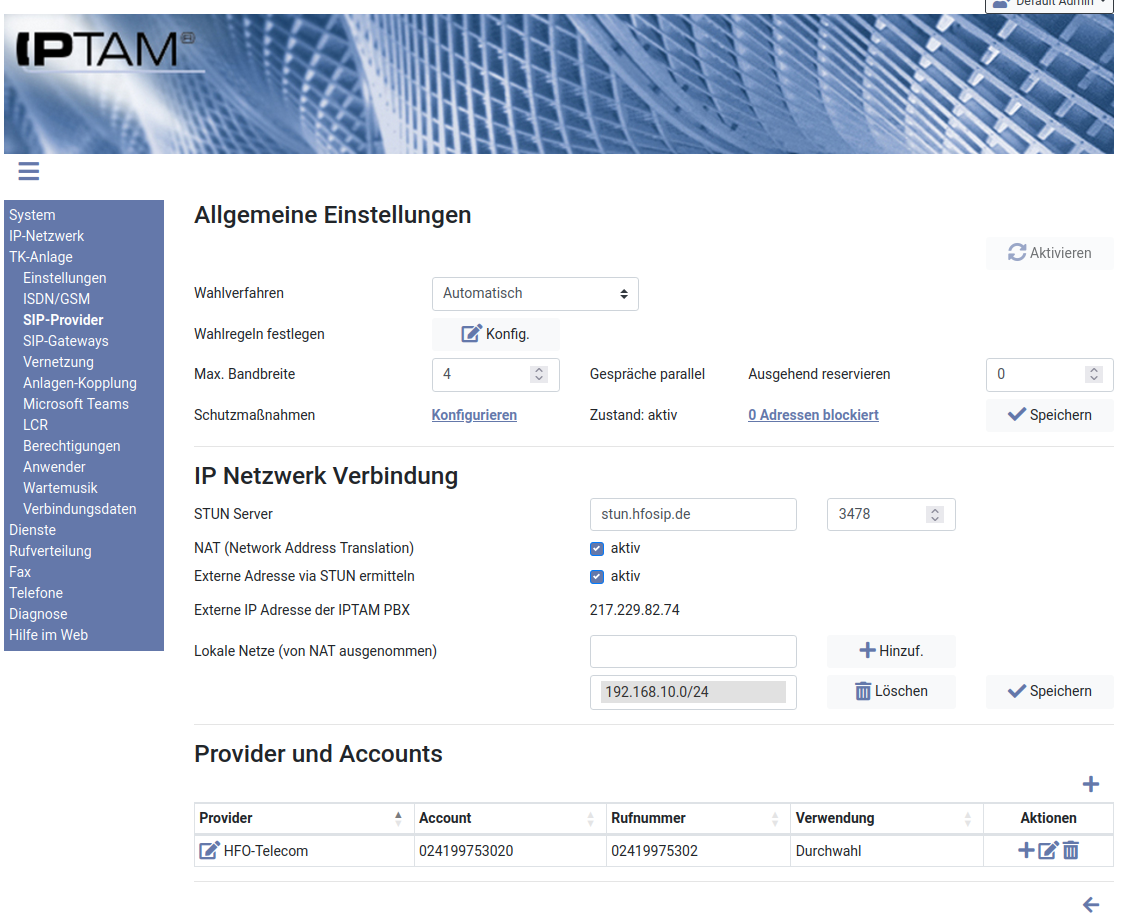 In der Regel wird Ihr Router eine feste externe IP-Adresse besitzen. Tragen Sie dann im Abschnitt „IP Netzwerk Verbindung“ diese Adresse ein und setzen Sie die Checkbox „NAT“. Falls Ihr Anschluss über eine dynamische IP-Adresse verfügt, tragen Sie bei „STUN-Server“ den STUN-Server des Providers „stun.hfosip.de“ ein und setzen Sie die Checkboxen bei „NAT“ und bei „Externe Adresse via STUN ermitteln“. Ihre IPTAM® PBX wird Änderungen der öffentlichen Adresse automatisch erkennen und eine Neu-Registrierung ausführen.