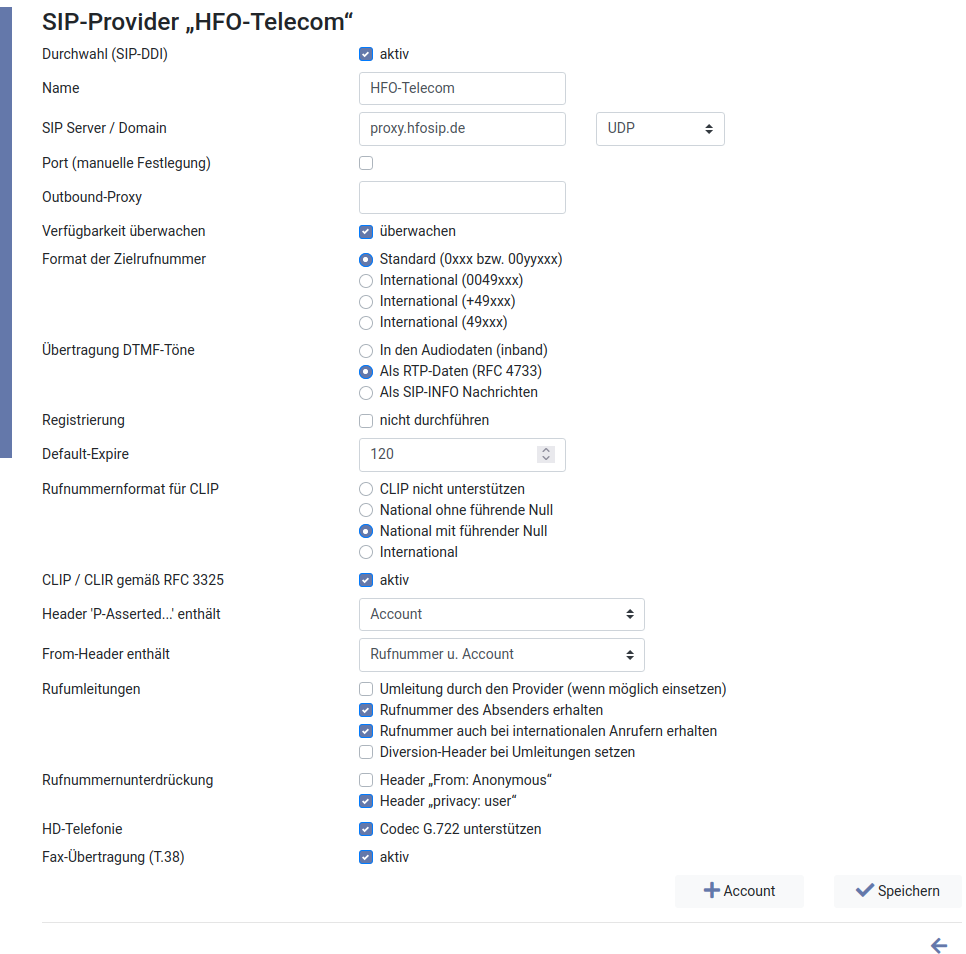 Mit den Produkten „HFO NGN Business“ bzw. „HFO NGN Connect“ bietet die HFO Telecom AG einen SIP-Trunk als Alternative zum ISDN-Anlagenanschlusses auf IP-Ebene an.Konfiguration