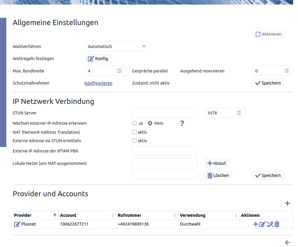 Bei diesem Provider kann die Einstellung im Bereich „NAT“ entfallen. Die Server beim Provider erkennen die öffentliche IP-Adresse ohne eine besondere Behandlung durch die IPTAM@ PBX. Falls es dennoch zu Problemen kommen sollte, folgen Sie den Einstellungen zur Konfiguration der IP Netzwerk Verbindung.