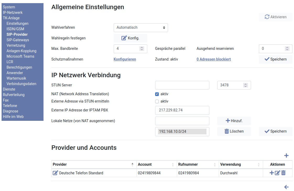 Bei „Lokale Netze (von NAT ausgenommen)“ tragen Sie das lokale Netz der Telefonanlage ein (z.B. 192.168.10.0/24, (Hinweise dazu). Ggf ergänzen Sie weitere Netze (z.B. wenn Sie Telefone via VPN an der IPTAM® PBX betreiben).