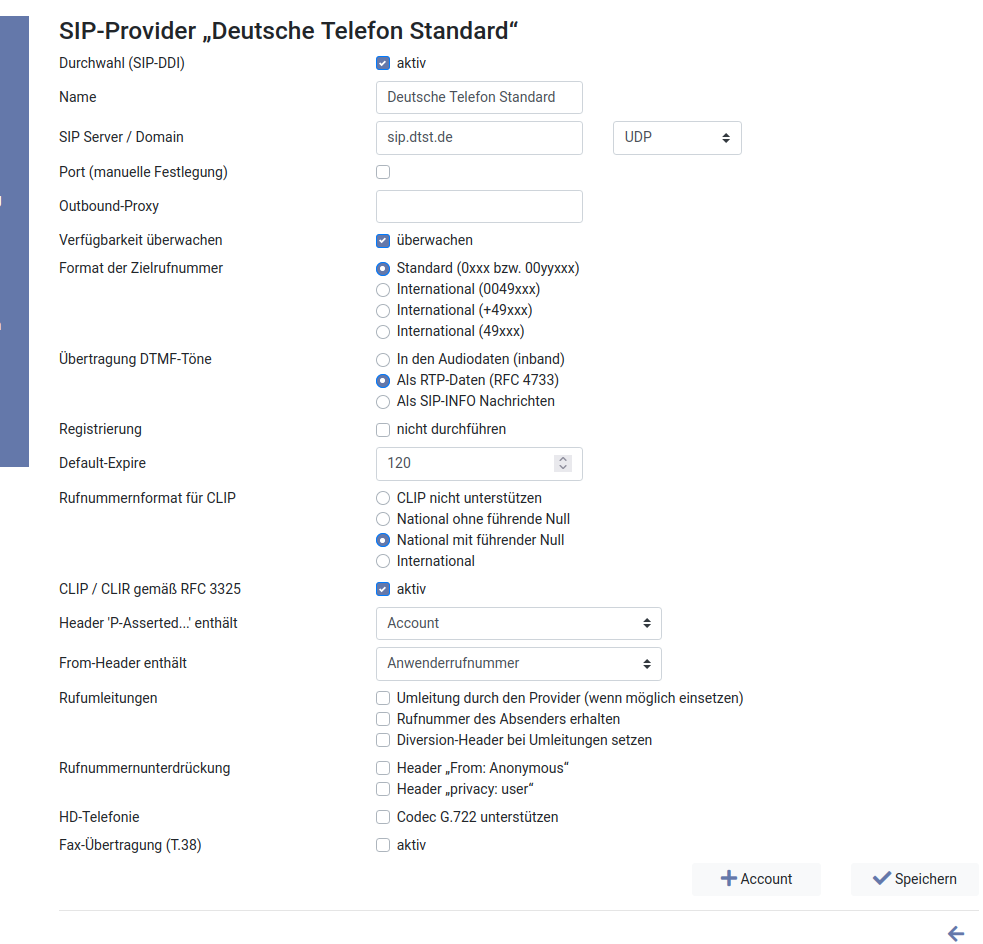 Bei Account wird der SIP-Account wie von der Deutschen Telefon Standard mitgeteilt eingetragen. Die „übermittelte Rufnummer“ wird im nationalen Format eingetragen, wobei die Rufnummer ohne den Rufnummernblock verwendet wird. Das Passwort tragen Sie wie vom Provider mitgeteilt ein.