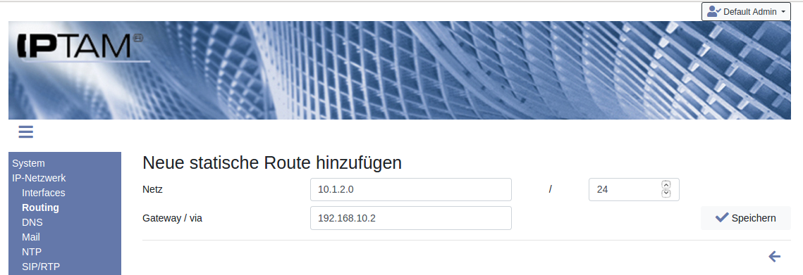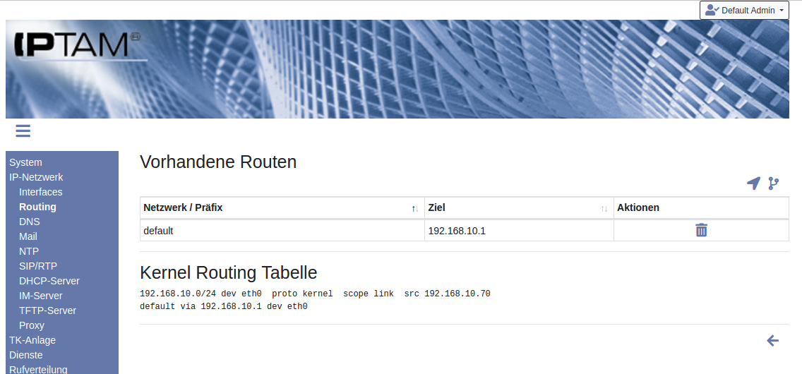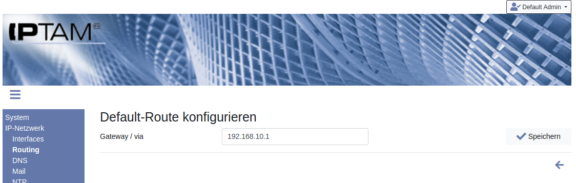 Image Um eine Default-Route festzulegen, über die Ihre IPTAM® IP-Telefonanlage andere Netze erreichen kann, klicken Sie auf das Icon . Dadurch öffnet sich die Maske zur Eingabe des Default Gateways, in die Sie die IP-Adresse des Routers oder der Firewall eingeben, die die Verbindung zu anderen IP-Netzen herstellt. Die Default Route wird benutzt, um Rechner zu erreichen, deren IP-Adressen sich nicht im lokalen Netz befinden und für die die Anlage auch keine statische Route kennt.