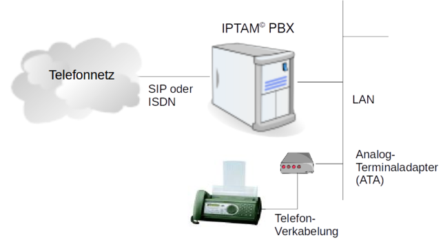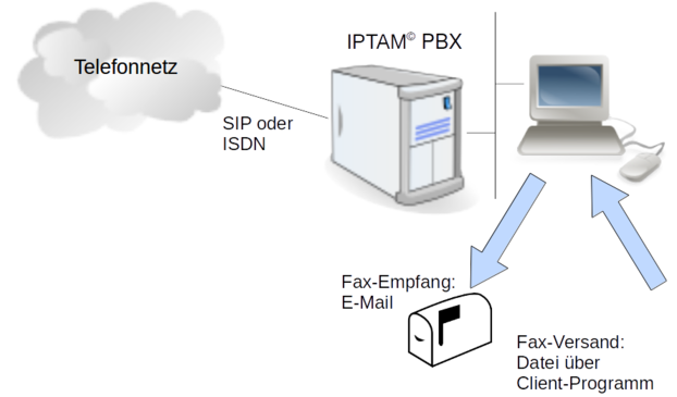 Die IPTAM PBX verfügt über einen integrierten Fax-Server. Der Fax-Server wird durch die Open Source Software Hylafax realisiert. Sie können mehrere Fax-Nebenstellen einrichten. An diesen Nebenstellen empfangene Fax-Dokumente werden als Anhang zu einer E-Mail dem entsprechenden Empfängern zugestellt oder können auch in einem Verzeichnis abgelegt werden. Das Format des E-Mail Anhangs ist entweder TIFF oder PDF. Für den Versand können Sie einen für Ihr Betriebssystem passendes Client-Programm wählen oder Sie nutzen die E-Mail-zu-Fax-Funktion. Die Konfiguration des Fax-Servers ist hier beschrieben.