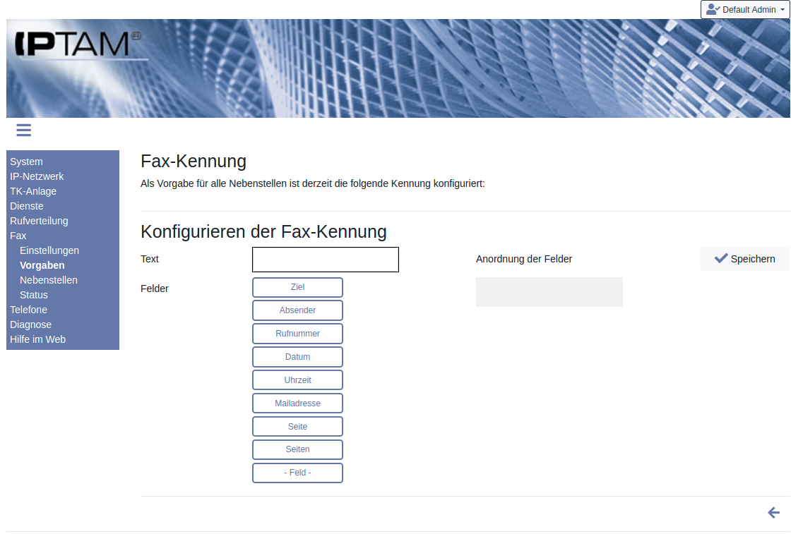 Nachdem Sie die Elemente Ihrer Kopfzeile zusammengestellt haben, sichern Sie die Einstellung über den Button „Speichern“. Ein Beispiel einer ausgefüllten Fax-Kennung sehen Sie in der Abbildung rechts.