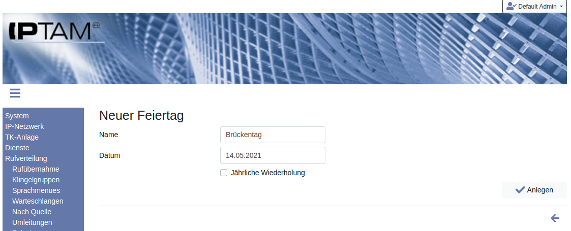 Image Wenn Sie Tage als Feiertag ergänzen wollen, die nicht zu den gesetzlichen oder kirchlichen Feiertagen gehören, können Sie dies über das Icon erreichen (Abbildung rechts). Legen Sie einen Namen fest, wählen das Datum und klicken Sie auf „Jährliche Wiederholung“, falls dies ein wiederkehrender Feiertag ist. Im Beispiel wird der 14.5.2021 als Brückentag eingetragen, weil der 13.5.2021 als Donnerstag ein Feiertag ist. Klicken Sie auf „Anlegen“, um die Einstellung zu übernehmen.