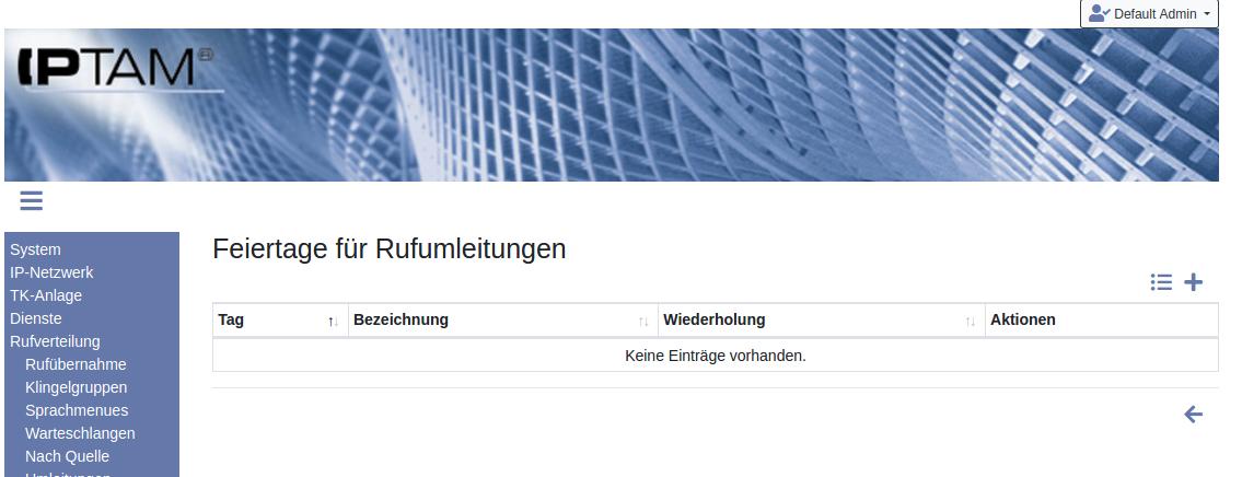 Neben den Wochentagen kann auch der Status „Feiertag“ ausgewählt werden. Was ein „Feiertag“ ist, legt der Administrator der IPTAM® PBX im Menü Rufverteilung►Feiertage fest.